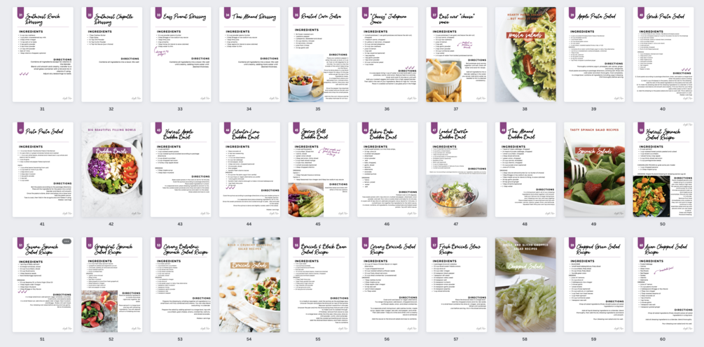 Easy to follow recipes & helpful tips on staying motivated. Enjoy all the salad basics you'll need to become a bowl skill pro. 35 scrumptious salad recipes & 14 salad dressings you're gonna love. Also added 2 bonus recipes (savory dips) & tons of extras like a: grocery list printable, meal planner printable, exclusive links to valuable resourses and lots more...